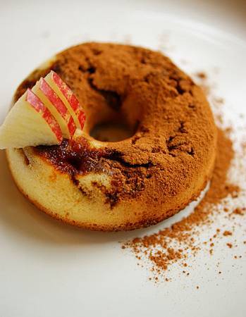 4. 模具抹油,底部放入焦糖蘋果丁,倒入麵糊,入烤箱前敲兩下以去除蘋果與麵糊間的空隙,180度烤18~20分。取出放涼,隨喜好裝飾新鮮蘋果與肉桂粉。