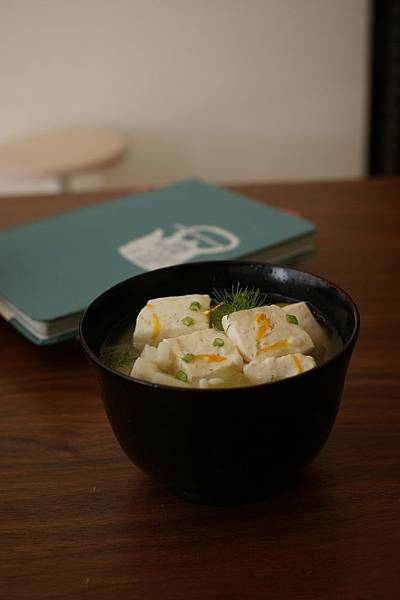 花蓮豆腐職人味萬田的絹豆腐,龍鬚菜果,加上味噌,和同樣是經過時間孕釀發酵的酒釀同煮,起鍋前撒上山藥丁和茴香。